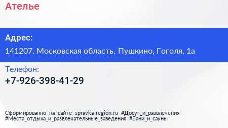 Ателье по адресу 141207, Московская область, Пушкино, Гоголя, 1а в дальнейшем Организация, размещена в следующих категориях:
