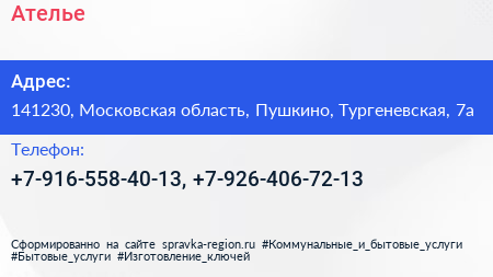 Ателье по адресу 141230, Московская область, Пушкино, Тургеневская, 7а в дальнейшем Организация, размещена в следующих категориях: