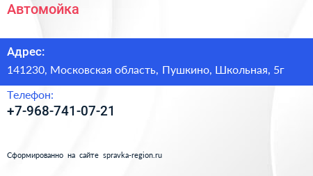 Автомойка по адресу 141230, Московская область, Пушкино, Школьная, 5г в дальнейшем Организация, размещена в следующих категориях: