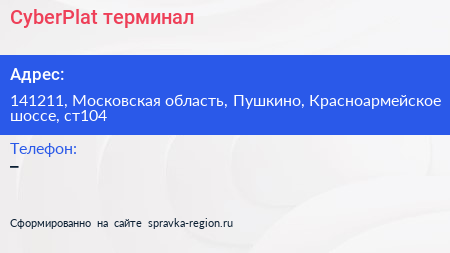 CyberPlat, терминал по адресу 141211, Московская область, Пушкино, Красноармейское шоссе, ст104 в дальнейшем Организация, размещена в следующих категориях: