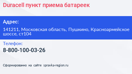 Duracell, пункт приема батареек по адресу 141211, Московская область, Пушкино, Красноармейское шоссе, ст104 в дальнейшем Организация, размещена в следующих категориях: