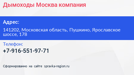 Дымоходы Москва, компания по адресу 141202, Московская область, Пушкино, Ярославское шоссе, 178 в дальнейшем Организация, размещена в следующих категориях: