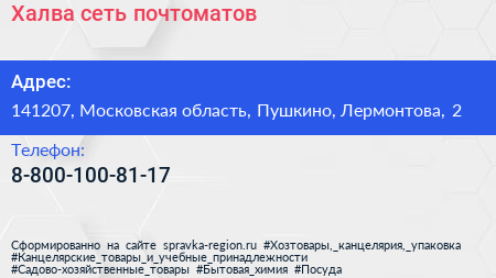 Халва, сеть почтоматов по адресу 141207, Московская область, Пушкино, Лермонтова, 2 в дальнейшем Организация, размещена в следующих категориях: