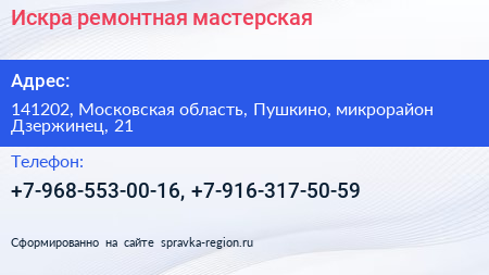 Искра, ремонтная мастерская по адресу 141202, Московская область, Пушкино, микрорайон Дзержинец, 21 в дальнейшем Организация, размещена в следующих категориях: