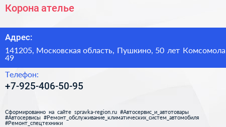 Корона, ателье по адресу 141205, Московская область, Пушкино, 50 лет Комсомола, 49 в дальнейшем Организация, размещена в следующих категориях: