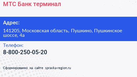 МТС-Банк, терминал по адресу 141205, Московская область, Пушкино, Пушкинское шоссе, 4а в дальнейшем Организация, размещена в следующих категориях: