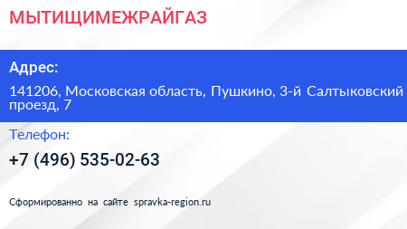 МЫТИЩИМЕЖРАЙГАЗ по адресу 141206, Московская область, Пушкино, 3-й Салтыковский проезд, 7 в дальнейшем Организация, размещена в следующих категориях:
