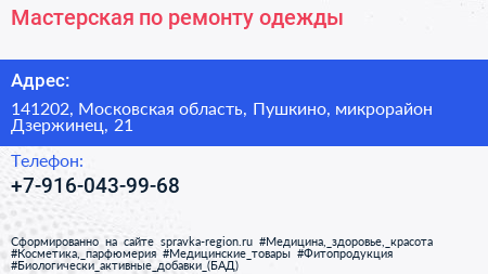 Мастерская по ремонту одежды по адресу 141202, Московская область, Пушкино, микрорайон Дзержинец, 21 в дальнейшем Организация, размещена в следующих категориях: