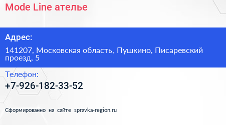 Mode Line, ателье по адресу 141207, Московская область, Пушкино, Писаревский проезд, 5 в дальнейшем Организация, размещена в следующих категориях: