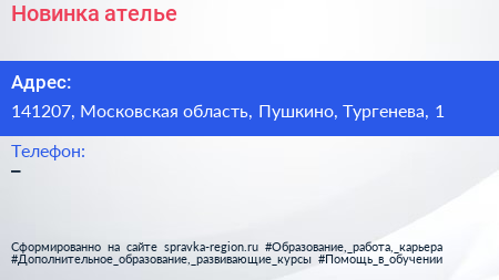 Новинка, ателье по адресу 141207, Московская область, Пушкино, Тургенева, 1 в дальнейшем Организация, размещена в следующих категориях: