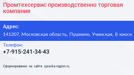 Промтехсервис, производственно-торговая компания по адресу 141207, Московская область, Пушкино, Учинская, 8 киоск в дальнейшем Организация, размещена в следующих категориях: