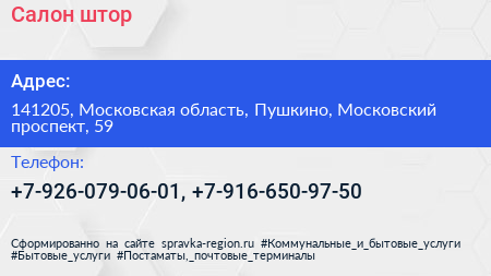Салон штор по адресу 141205, Московская область, Пушкино, Московский проспект, 59 в дальнейшем Организация, размещена в следующих категориях: