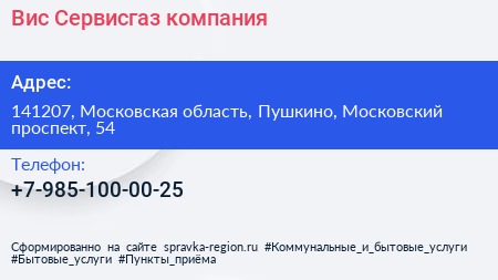 Вис-Сервисгаз, компания по адресу 141207, Московская область, Пушкино, Московский проспект, 54 в дальнейшем Организация, размещена в следующих категориях: