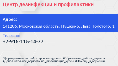 Центр дезинфекции и профилактики по адресу 141206, Московская область, Пушкино, Льва Толстого, 1 в дальнейшем Организация, размещена в следующих категориях: