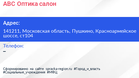 АВС-Оптика, салон по адресу 141211, Московская область, Пушкино, Красноармейское шоссе, ст104 в дальнейшем Организация, размещена в следующих категориях: