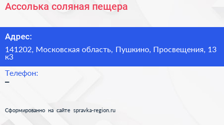 Ассолька, соляная пещера по адресу 141202, Московская область, Пушкино, Просвещения, 13 к3 в дальнейшем Организация, размещена в следующих категориях:
