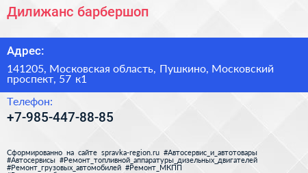 Дилижанс, барбершоп по адресу 141205, Московская область, Пушкино, Московский проспект, 57 к1 в дальнейшем Организация, размещена в следующих категориях: