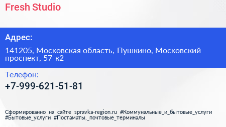 Fresh Studio по адресу 141205, Московская область, Пушкино, Московский проспект, 57 к2 в дальнейшем Организация, размещена в следующих категориях:
