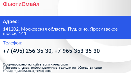 ФьютиСмайл по адресу 141202, Московская область, Пушкино, Ярославское шоссе, 141 в дальнейшем Организация, размещена в следующих категориях: