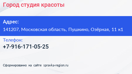 Город, студия красоты по адресу 141207, Московская область, Пушкино, Озёрная, 11 к1 в дальнейшем Организация, размещена в следующих категориях: