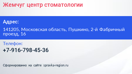 Жемчуг, центр стоматологии по адресу 141205, Московская область, Пушкино, 2-й Фабричный проезд, 16 в дальнейшем Организация, размещена в следующих категориях: