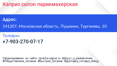 Каприз, салон-парикмахерская по адресу 141207, Московская область, Пушкино, Тургенева, 10 в дальнейшем Организация, размещена в следующих категориях: