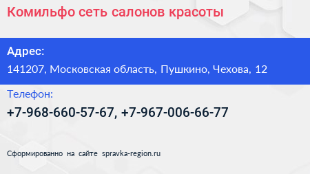 Комильфо, сеть салонов красоты по адресу 141207, Московская область, Пушкино, Чехова, 12 в дальнейшем Организация, размещена в следующих категориях: