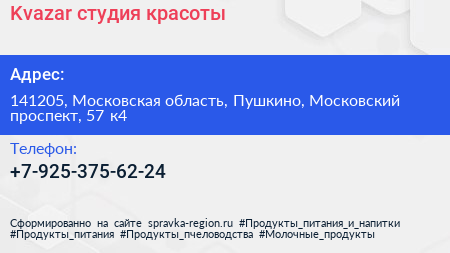 Kvazar, студия красоты по адресу 141205, Московская область, Пушкино, Московский проспект, 57 к4 в дальнейшем Организация, размещена в следующих категориях: