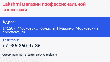 Lakshmi, магазин профессиональной косметики по адресу 141207, Московская область, Пушкино, Московский проспект, 7а в дальнейшем Организация, размещена в следующих категориях: