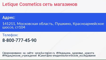 Letique Cosmetics, сеть магазинов по адресу 141211, Московская область, Пушкино, Красноармейское шоссе, ст104 в дальнейшем Организация, размещена в следующих категориях:
