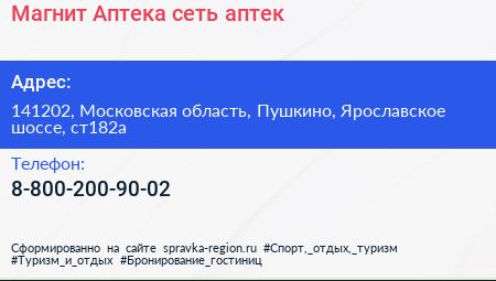 Магнит Аптека, сеть аптек по адресу 141202, Московская область, Пушкино, Ярославское шоссе, ст182а в дальнейшем Организация, размещена в следующих категориях: