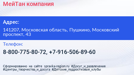 МейТан, компания по адресу 141207, Московская область, Пушкино, Московский проспект, 43 в дальнейшем Организация, размещена в следующих категориях: