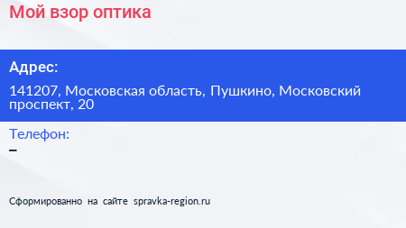 Мой взор, оптика по адресу 141207, Московская область, Пушкино, Московский проспект, 20 в дальнейшем Организация, размещена в следующих категориях: