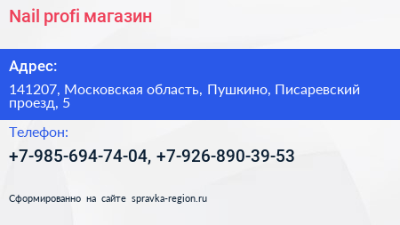 Nail profi, магазин по адресу 141207, Московская область, Пушкино, Писаревский проезд, 5 в дальнейшем Организация, размещена в следующих категориях: