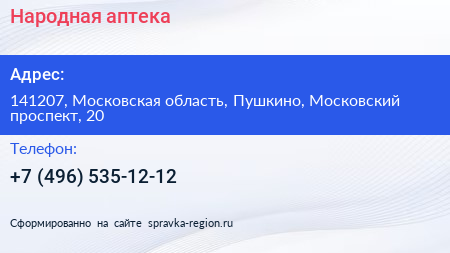 Народная аптека по адресу 141207, Московская область, Пушкино, Московский проспект, 20 в дальнейшем Организация, размещена в следующих категориях: