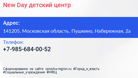 New Day, детский центр по адресу 141205, Московская область, Пушкино, Набережная, 2а в дальнейшем Организация, размещена в следующих категориях:
