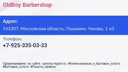 OldBoy Barbershop по адресу 141207, Московская область, Пушкино, Чехова, 1 к3 в дальнейшем Организация, размещена в следующих категориях: