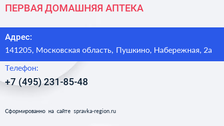 ПЕРВАЯ ДОМАШНЯЯ АПТЕКА по адресу 141205, Московская область, Пушкино, Набережная, 2а в дальнейшем Организация, размещена в следующих категориях:
