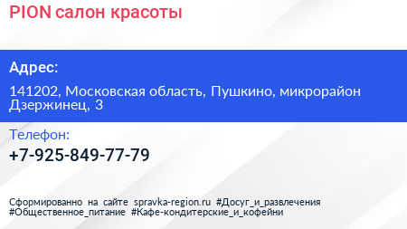 PION, салон красоты по адресу 141202, Московская область, Пушкино, микрорайон Дзержинец, 3 в дальнейшем Организация, размещена в следующих категориях: