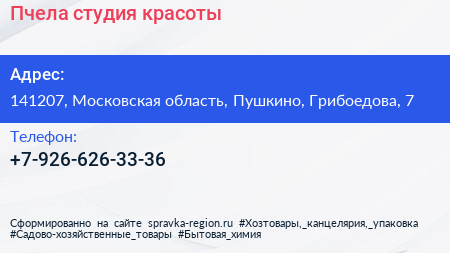 Пчела, студия красоты по адресу 141207, Московская область, Пушкино, Грибоедова, 7 в дальнейшем Организация, размещена в следующих категориях: