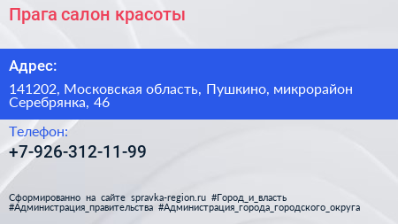 Прага, салон красоты по адресу 141202, Московская область, Пушкино, микрорайон Серебрянка, 46 в дальнейшем Организация, размещена в следующих категориях: