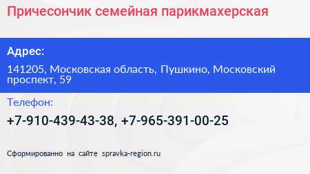 Причесончик, семейная парикмахерская по адресу 141205, Московская область, Пушкино, Московский проспект, 59 в дальнейшем Организация, размещена в следующих категориях: