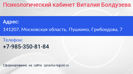 Психологический кабинет Виталия Болдузева по адресу 141207, Московская область, Пушкино, Грибоедова, 7 в дальнейшем Организация, размещена в следующих категориях: