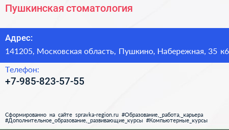 Пушкинская, стоматология по адресу 141205, Московская область, Пушкино, Набережная, 35 к6 в дальнейшем Организация, размещена в следующих категориях: