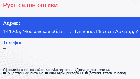 Русь, салон оптики по адресу 141205, Московская область, Пушкино, Инессы Арманд, 6 в дальнейшем Организация, размещена в следующих категориях:
