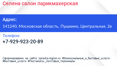 Селена, салон-парикмахерская по адресу 141240, Московская область, Пушкино, Центральная, 2в в дальнейшем Организация, размещена в следующих категориях: