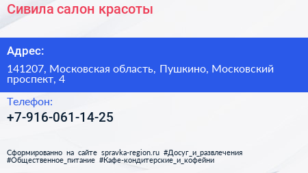 Сивила, салон красоты по адресу 141207, Московская область, Пушкино, Московский проспект, 4 в дальнейшем Организация, размещена в следующих категориях: