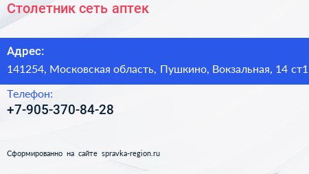 Столетник, сеть аптек по адресу 141254, Московская область, Пушкино, Вокзальная, 14 ст1 в дальнейшем Организация, размещена в следующих категориях: