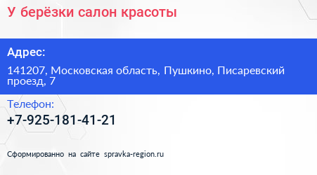 У берёзки, салон красоты по адресу 141207, Московская область, Пушкино, Писаревский проезд, 7 в дальнейшем Организация, размещена в следующих категориях: