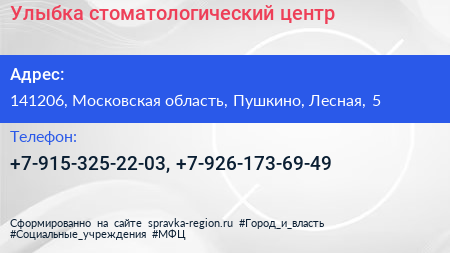 Улыбка, стоматологический центр по адресу 141206, Московская область, Пушкино, Лесная, 5 в дальнейшем Организация, размещена в следующих категориях: